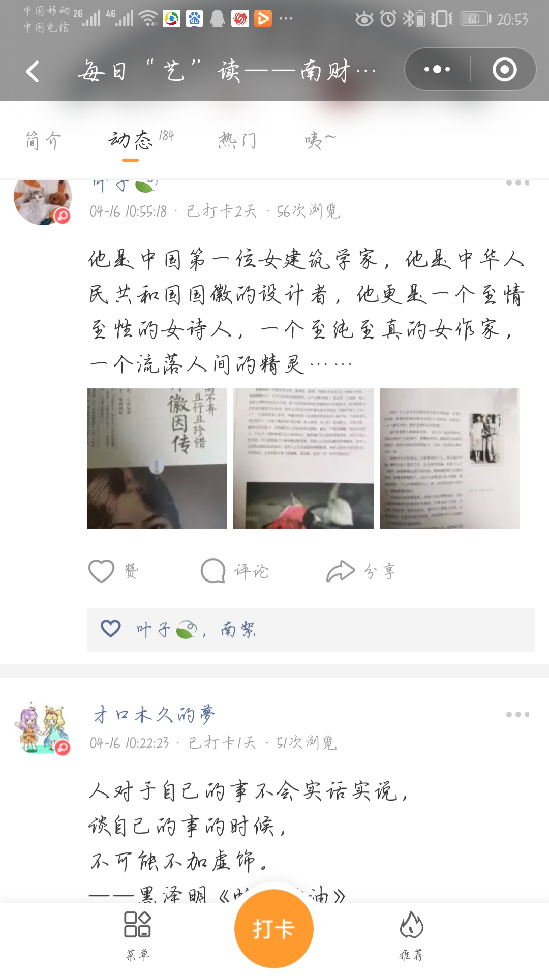 在活动中,同学们有的阅读了与专业相关的书籍,如《达·芬奇手记》、《世界现代设计史》、《设计艺术经典论著选读》,有的阅读人物传记《林徽因传》,有的阅读了世界名著《平凡的世界》、鲁迅名著《朝花夕拾》、《傅雷家书》等,大家在完成每日阅读后根据打卡指令在活动专区将自己的阅读情况如内容、感悟、书评等进行记录与分享,与同学们共勉。